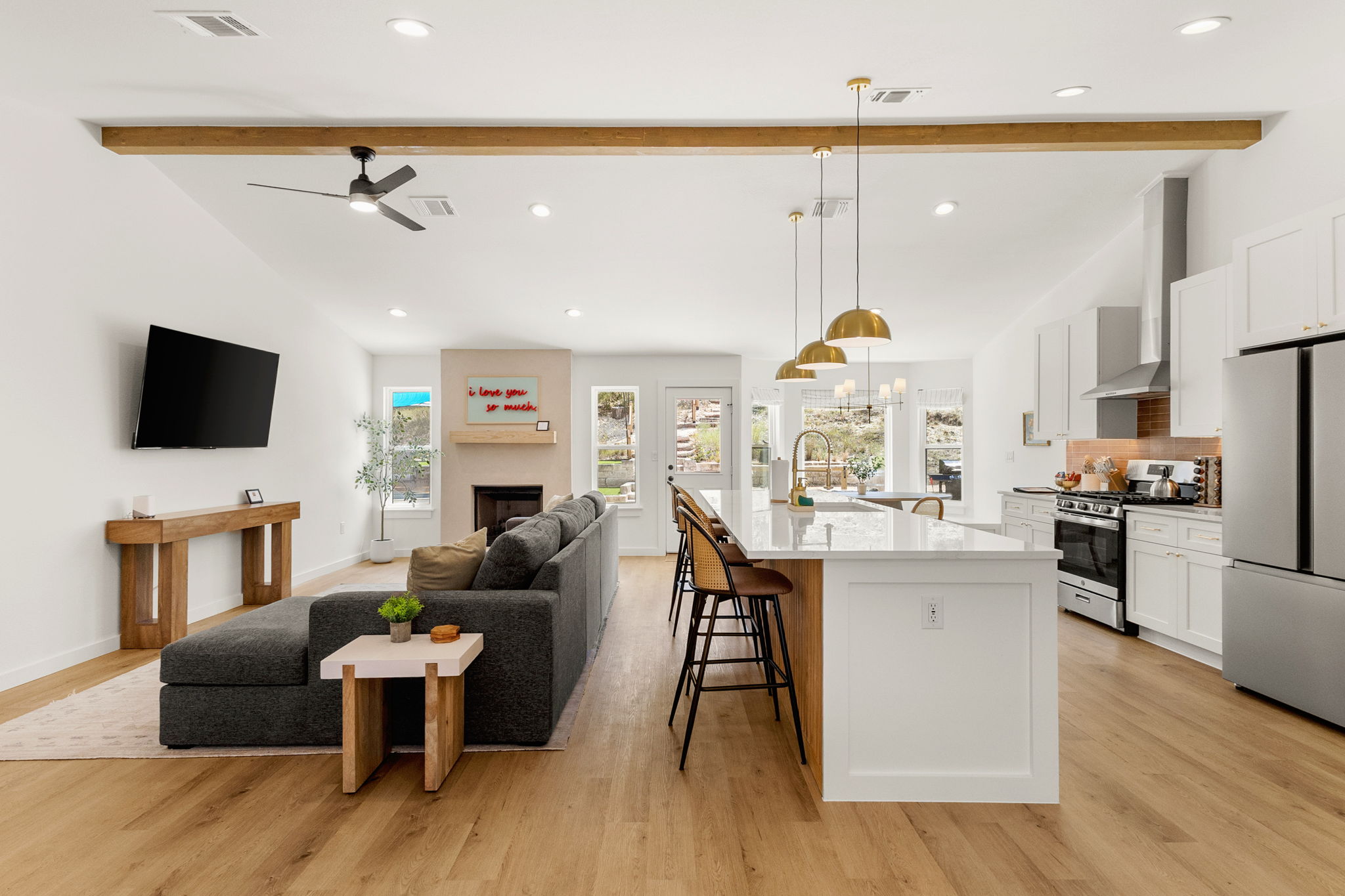 Step into the welcoming open-concept living area that blends modern amenities with gorgeous furnishings. The spacious living area combines the fully equipped kitchen that opens to a tastefully furnished living room and the inviting dining area.